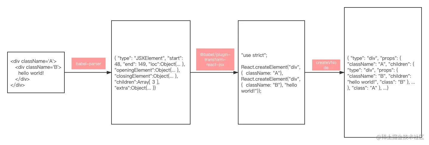 本文研究下JSX语法到vdom的基本流程,研究其核心的三个转换流程,流程如下: