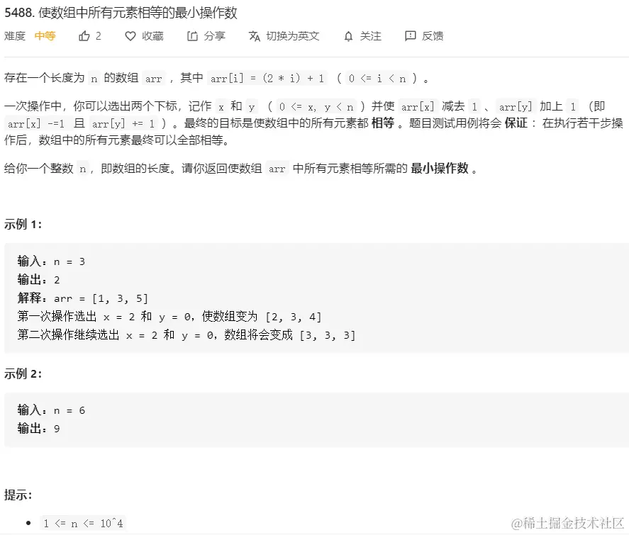 用等差数列求和公式计算一下就知道,不管n为多少,所有数的和都是n^2,这样平均数就是n,由于数组前半部分和后半部分关于n对称(关于中间位置对称的两个位置的 两个元素相加和为2*n),所以我们只需要遍历数组的前半部分,把所有数和n的差值加起来,就是最终的答案了。