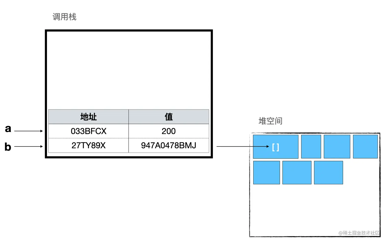 对于栈空间,变量a是基本数据类型,所以具有唯一内存标识,对应在栈里面的一个值。而对于变量b,执行上下文也会为其分配一定的栈内存,不过存储的是指向堆的一个内存区域,用于数组的存储,该数组是动态分配的。这样很好的看出,基本类型和引用类型在存储上的区别了。