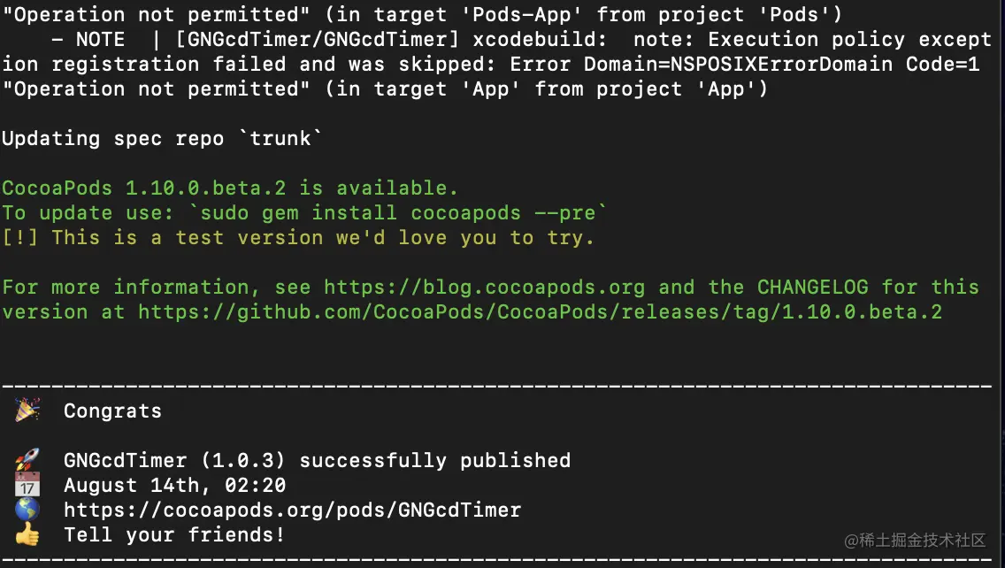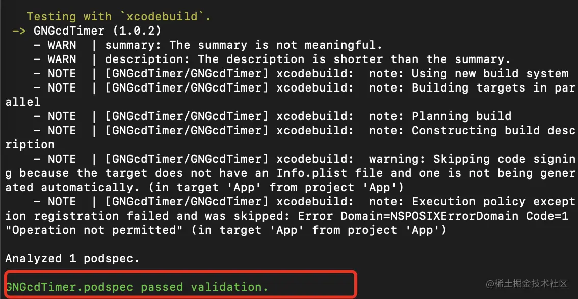 验证如果成功之后,直接提交就行了。不过可能刚开始或多或少可能会有一些失败,大部分情况都是因为podspec文件中的语法有错,具体需要看日志的error信息,然后再根据不同情况来做修改。