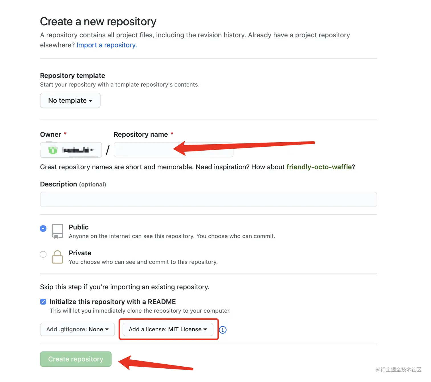 下面的LICENSE需要选择MIT LICENSE,然后创建仓库。