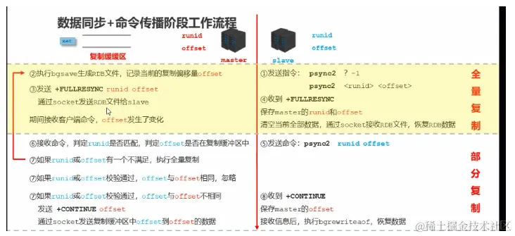 master接收到命令以后,会把命令放到复制缓冲区里面,复制缓冲区里保存了字节值以及对应的偏移量;相当于AOF,用于保存所有master收到的指令