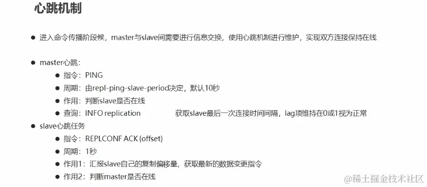 进入命令传播阶段以后,master需要和slave进行信息交换,使用心跳机制来维护,实时保持双方保持在线