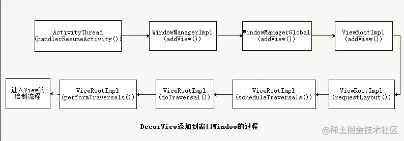 而DecorView的绘制相关则是依赖于ViewRootImp进行和Window进行上述相关的绘制流程的。补充一句,基本所有View绘制相关的都是和ViewRootImp相关。之后通过上图的流转方式,最后进入到ViewRootImp的performTraversals环节中。
