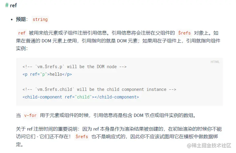 // 通过 Vue 实例的 $refs 获取标记 ref 属性的元素