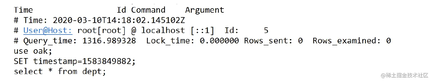 time:日志记录的时间 User@Host:执行的用户及主机 Query_time:执行的时间 Lock_time:锁表时间 Rows_sent:发送给请求方的记录数,结果数量 Rows_examined:语句扫描的记录条数 SET timestamp:语句执行的时间点 select....:执行的具体的SQL语句