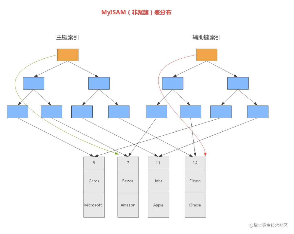 非聚簇索引 : MyISAM数据表的索引文件和数据文件是分开的,被称为非聚簇索引结 构。