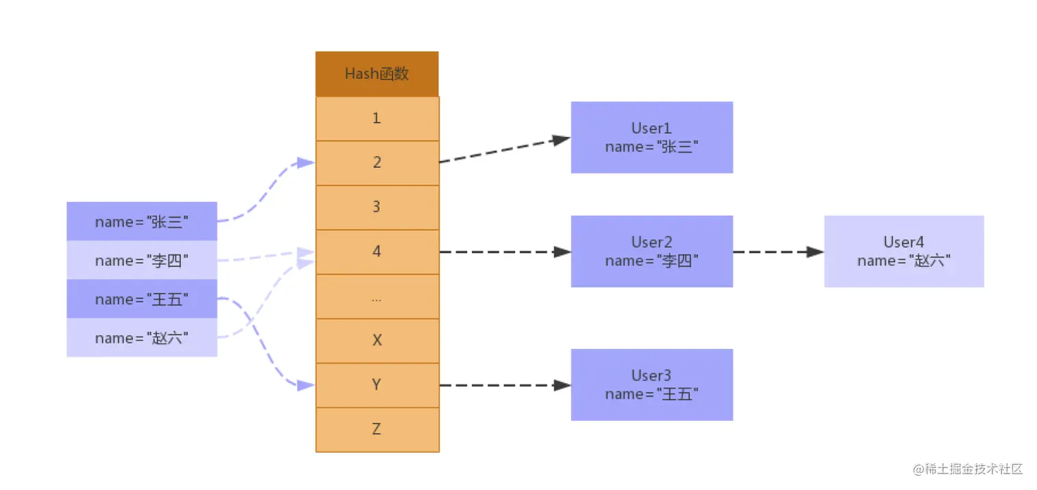 根据键值 <key,value> 存储数据的结构。非常适合根据key查找value值,也就是单个key查询。其结构如下所示: