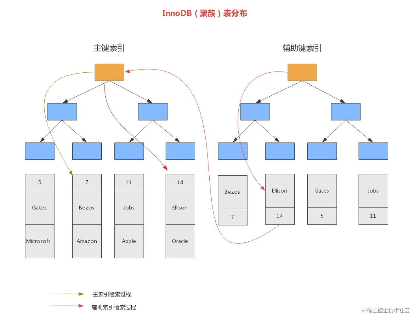 主键索引和辅助索引:B+Tree的叶子节点存放的是主键字段值就属于主键索引;如果存放的是非主键值 就属于辅助索引(二级索引)。