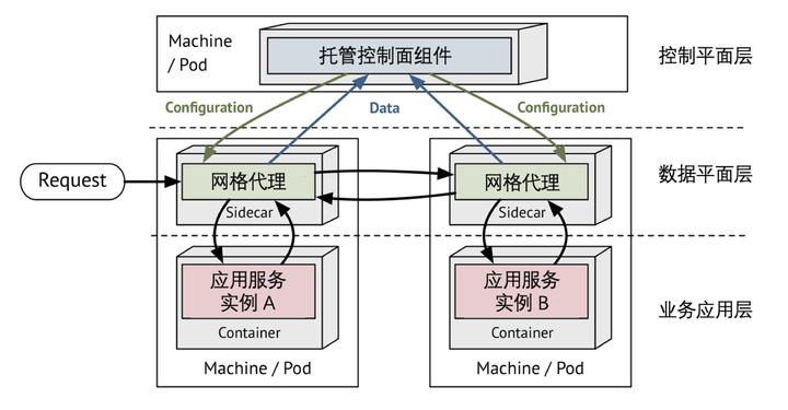随着这些 Sidecar 代理功能的增强,原本需要在代码库中实现的服务治理功能被抽象化为一个个通用组件, 并被逐渐地下沉到代理中。这些服务治理能力的标准化、统一化,可以解决复杂系统微服务实现中面临的差异大、缺少共性的问题,可以很好地支持不同的编程语言、不同的框架。