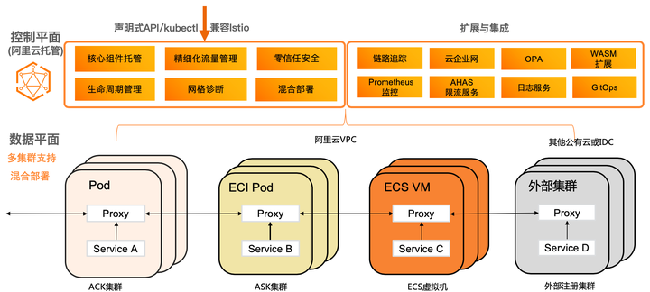在数据平面的支持上,ASM 产品可以支持多种不同的计算基础设施,这包括了阿里云提供的公有云 ACK 集群(其中包括了托管的 K8s 集群和专有 K8s 集群)、也包括对的无服务器 Kubernetes 容器服务 ASK 集群的支持。同时, 对非容器化应用例如运行在 ECS 虚拟机上的应用服务网格化的支持。
