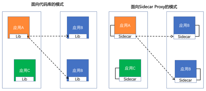 通过把这些服务治理的能力 Sidecar 化,就能够把服务治理的能力与应用程序本身进行了解耦,可以较好地支持多种编程语言、同时这些 Sidecar 能力不需要依赖于某种特定技术框架。这就是我们常说的面向 Sidecar proxy 的架构模式。