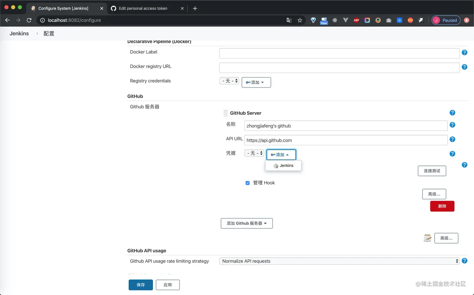 3.进入jenkins工作台,系统管理 》》系统配置 》》GitHub,进行添加jenkins