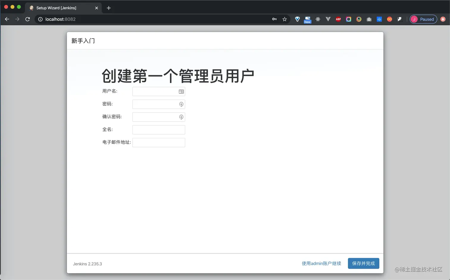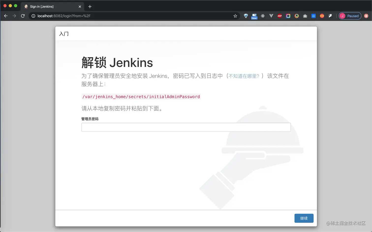 docker exec -it containerName /bin/bash进入容器,然后通过cat /var/jenkins_home/secrets/initialAdminPassword获取密码