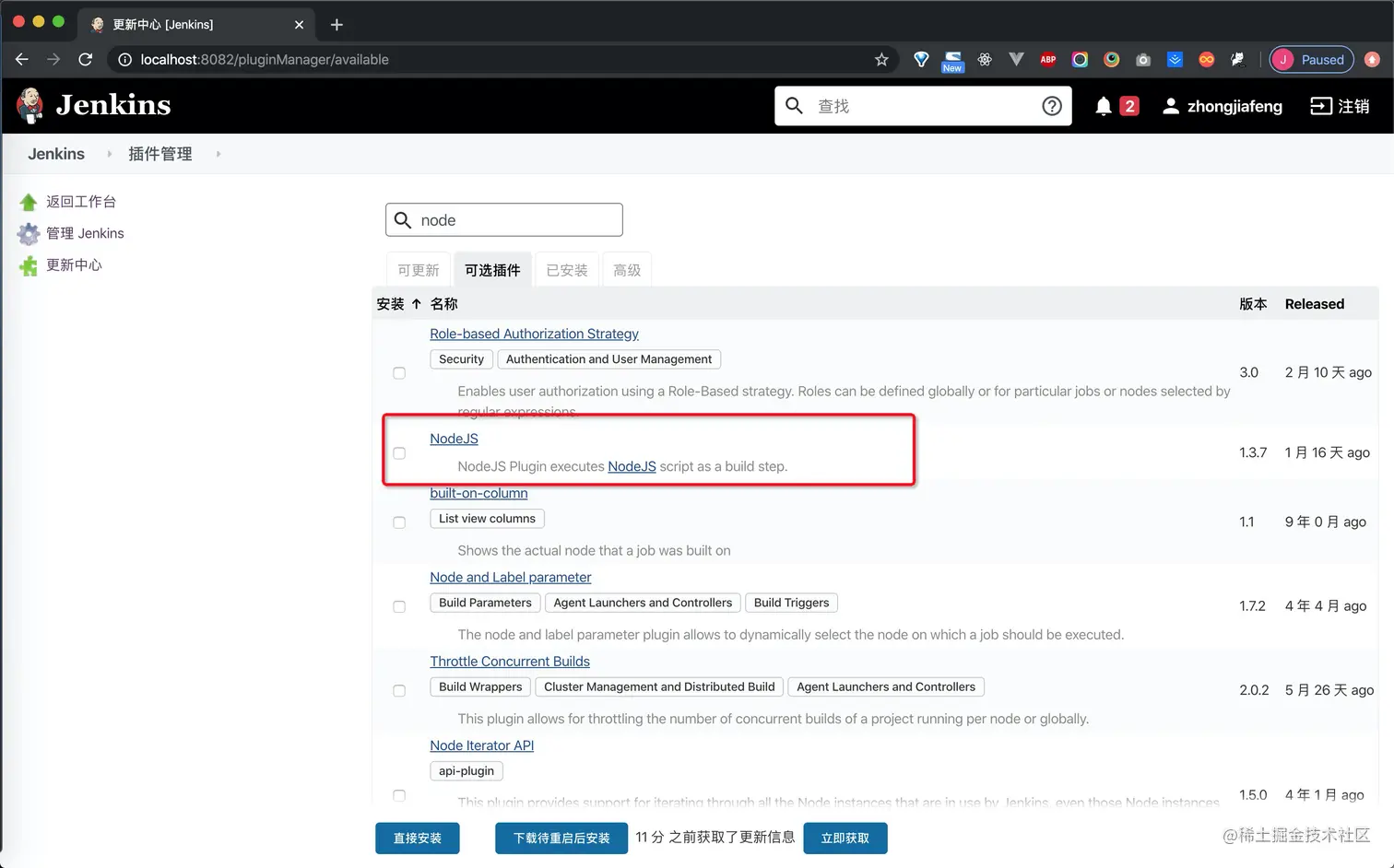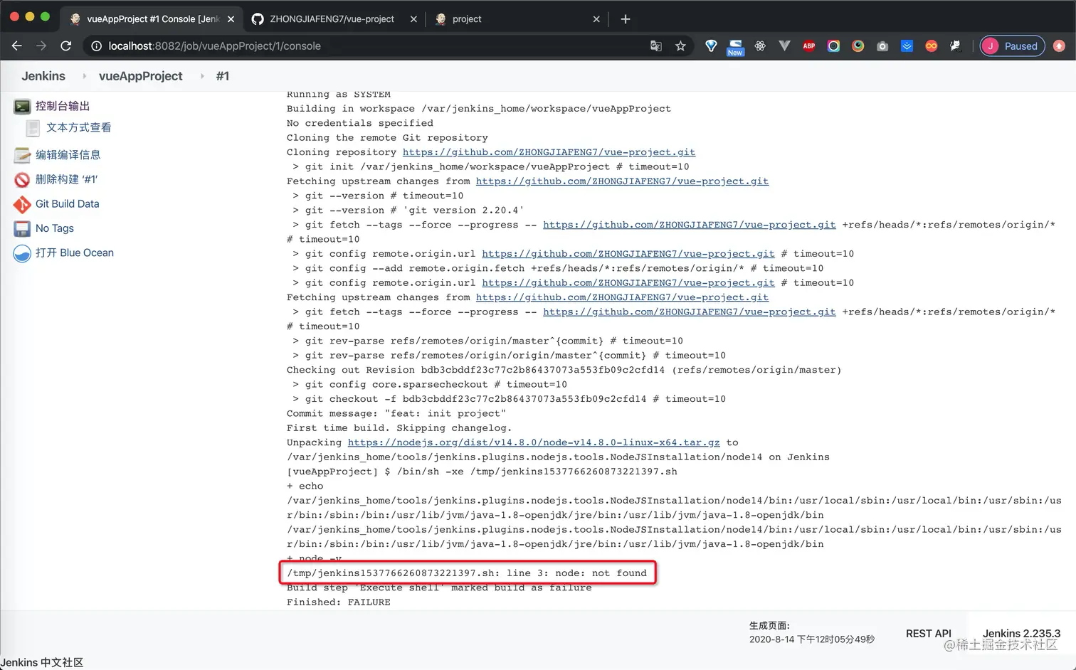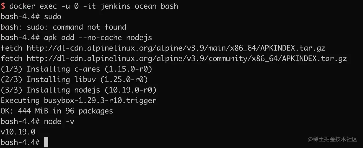 通过docker exec -u 0 -it <container_name> bash 然后执行apk add --no-cache nodejs,这个每次重启jenkins容器都要重写安装一遍,有点不方便。看到blueocean镜像体积比正常jenkins镜像小100M,可能是精简了一些导致找不到node依赖,可以替换镜像jenkins/jenkins镜像。