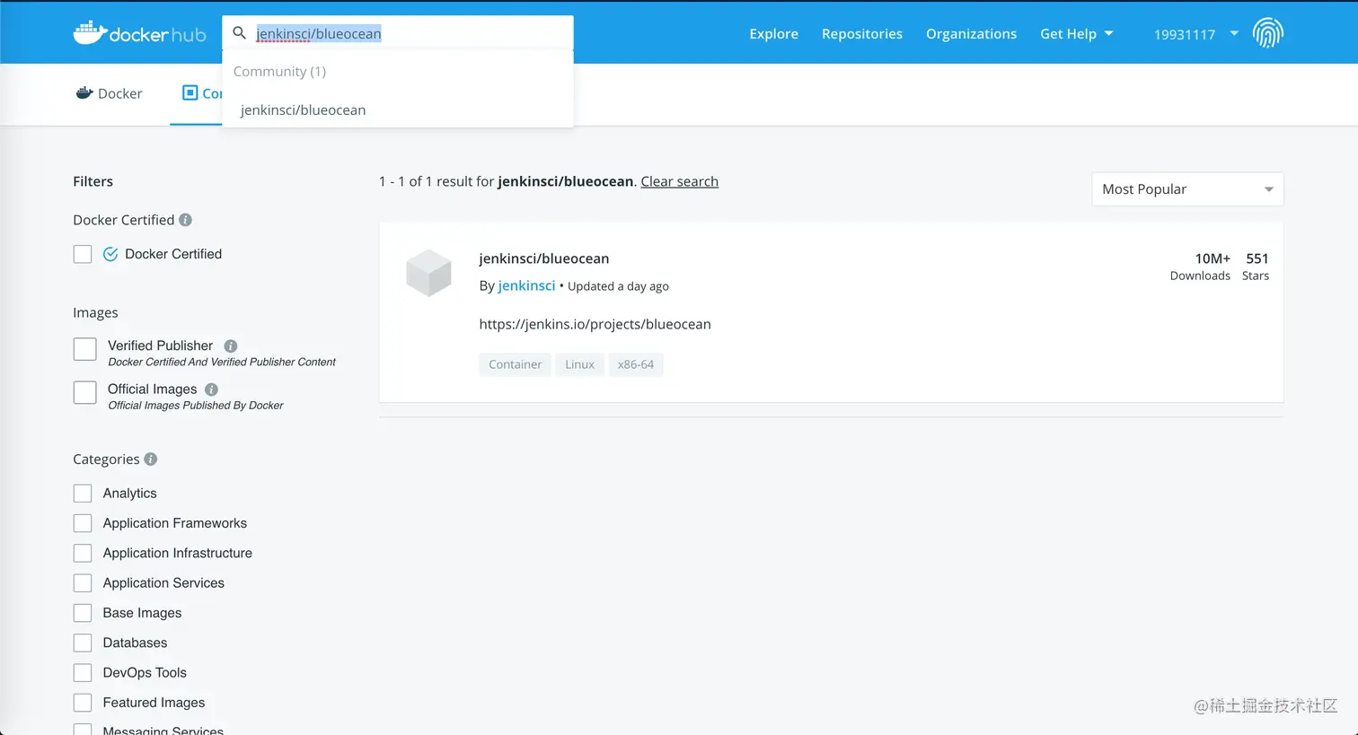 搜索jenkins镜像hub.docker.com/ , 选择jenkinsci/blueocean