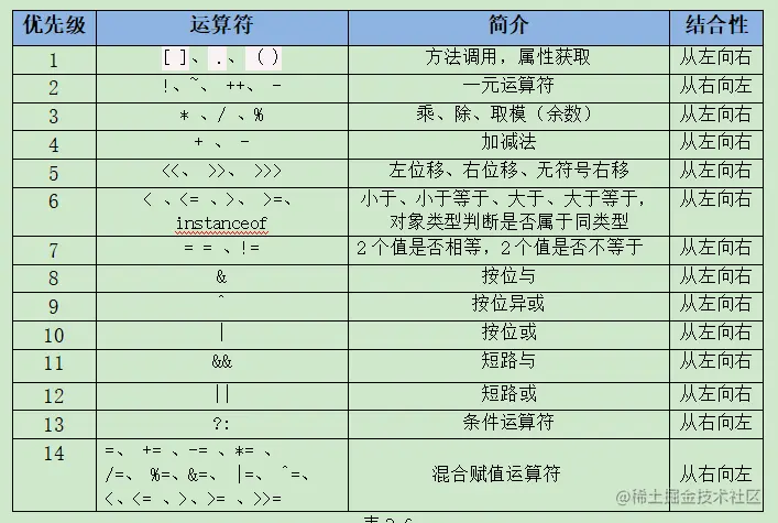 和数学中的运算符一样,Java运算符也存在优先级关系。在Java表达式中,优先级高的运算符先参与运算,优先级低的运算符后参与运算。下表给出了运算符的优先级,表中优先级栏,数字越小优先级越高,每个运算符用中文顿号分割。