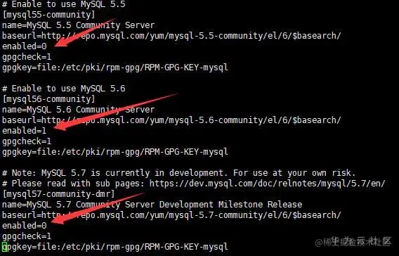 修改内容:将所要更新的版本的enabled=1,其他版本的enabled=0即可,如下图所示,只更新到mysql 5.6版本: