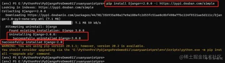 (env) PS E:\PythonPro\PyDjangoProDemo011\xuanyuaniotpro> pip install Django==2.0.0 -i https://pypi.douban.com/simple