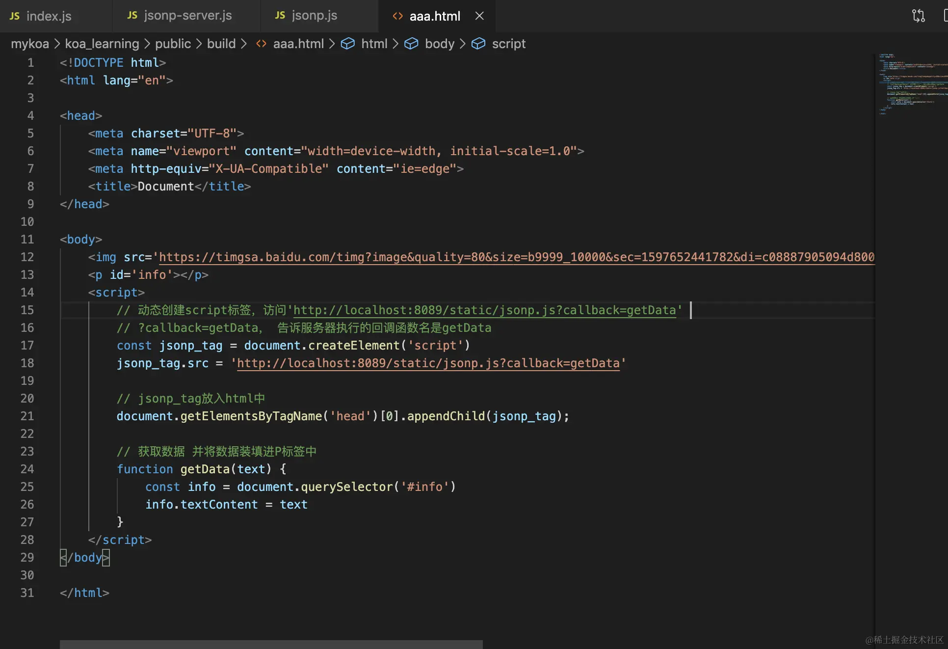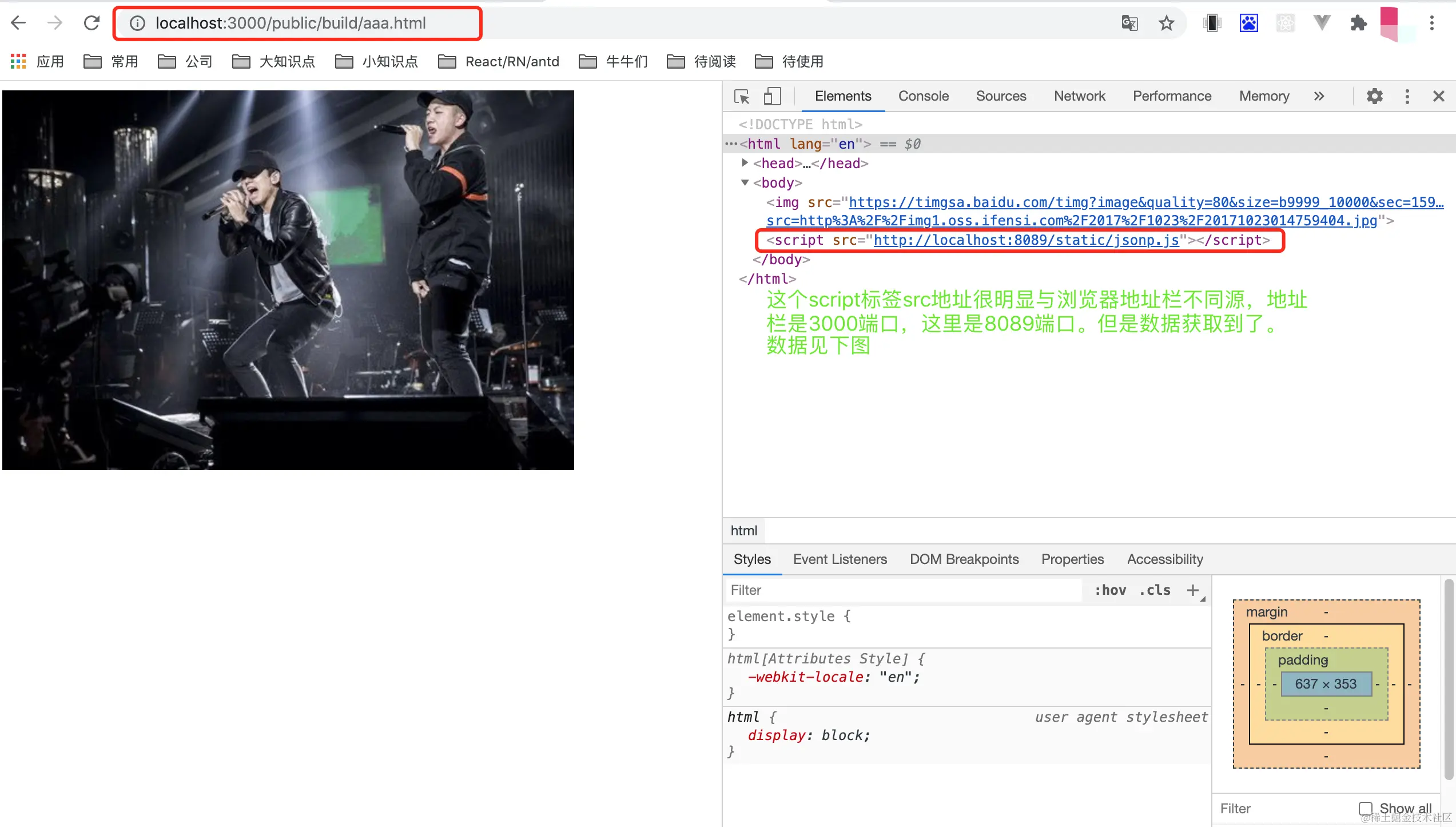 由于同源策略限制,我们无法请求不同源的数据,但是我们发现图片的src属性可以访问不同源的资源,见下图http://localhost:3000/public/build/aaa.html访问一张网络上的图片资源。