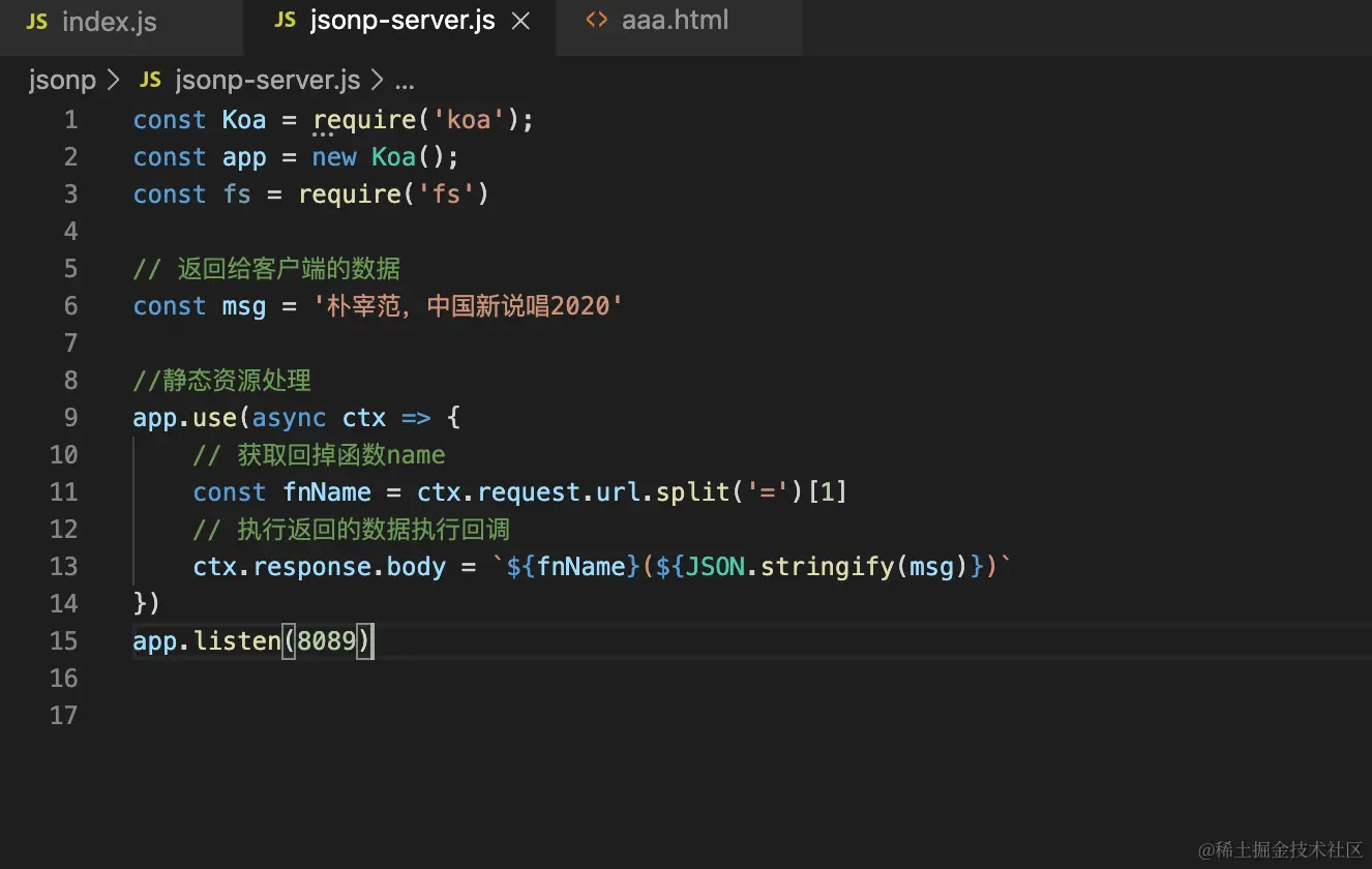 <script src = 'http://localhost:8089/static/jsonp.js?callback=getData'></script>去请求服务器资源,服务器解析请求的url中callback的值getData,然后执行getData(),并传入需要返回给客户端的数据'朴宰范,中国新说唱2020',这一波操作就相当于在dom中<script>getData('朴宰范,中国新说唱2020')</script> -