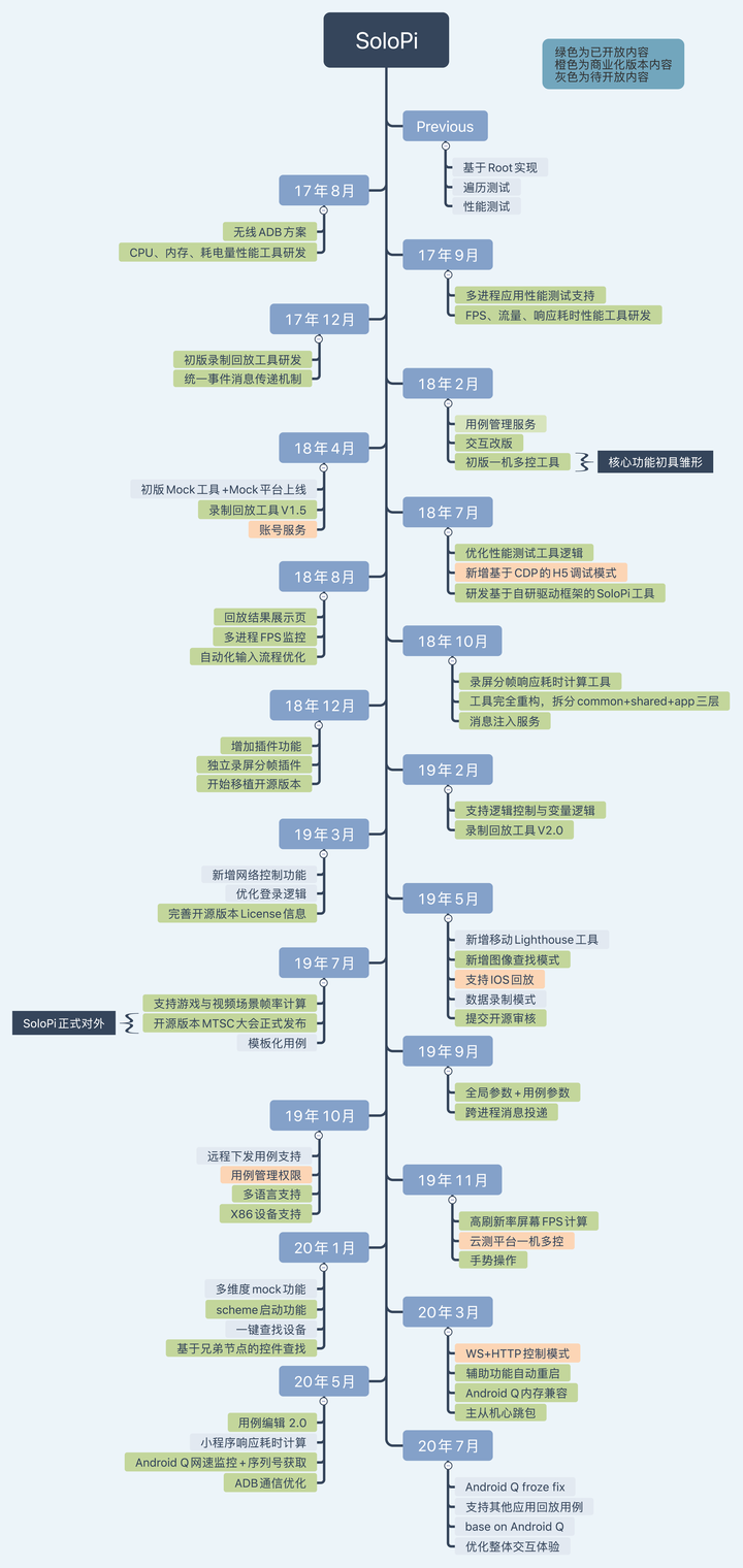 其实,这套工具我们从17年开始研发,至今已经有三年的历史了,最开始SoloPi本身只是一个性能测试工具,随后逐步扩展成涵盖功能测试、性能测试、兼容性测试、异常测试、Mock测试等一系列移动端测试场景的测试框架,这一路走来,SoloPi就像我们的孩子一样一步一步地成长,稳步且有计划的前进着。