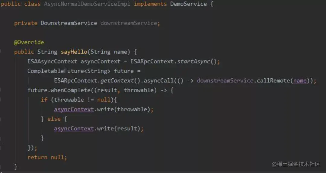 RPC 调用等待下游response 返回时,线程不应处于block 状态;作为微服务架构中数据流量最大的一部分,RPC 调用异步化的收益巨大;目前ESA RPC 已经具备了纯异步化的能力,提供RPC 调用的服务一般既是客户端也是服务端,因此包含了客户端异步调用能力和服务端异步处理能力;为了兼容存量接口,ESA RPC 既支持CompletableFuture 也支持普通返回值的接口。