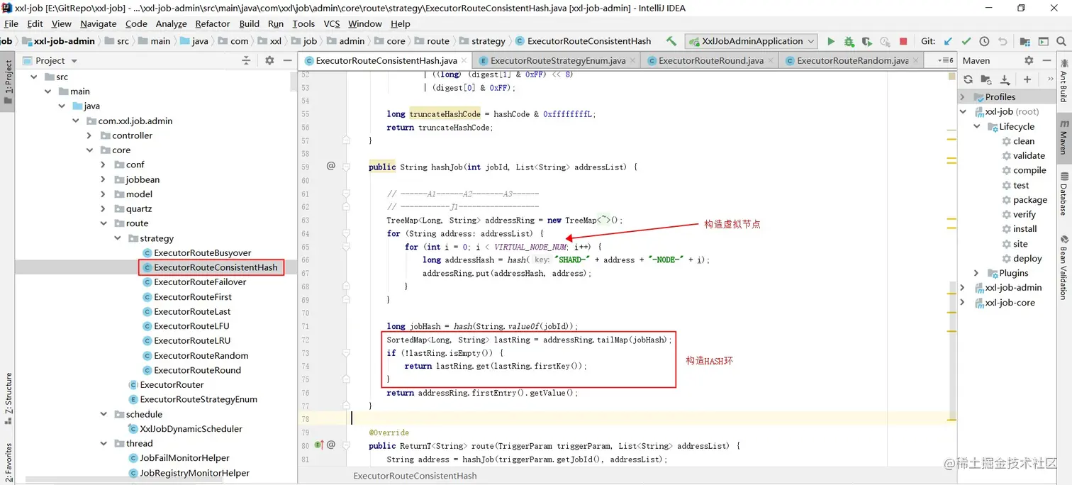 亮点:利用MD5加密jobId,并和0xffffffffL做与操作构成32位的HASH环;利用TreeMap和SortedMap来构造HASH环,关键方法是tailMap(K fromKey) 方法,用于返回此映射,其键大于或等于fromKey的部分映射;多嵌套一层虚拟节点以防止同一时间的调用的任务的过多压垮服务的情况。