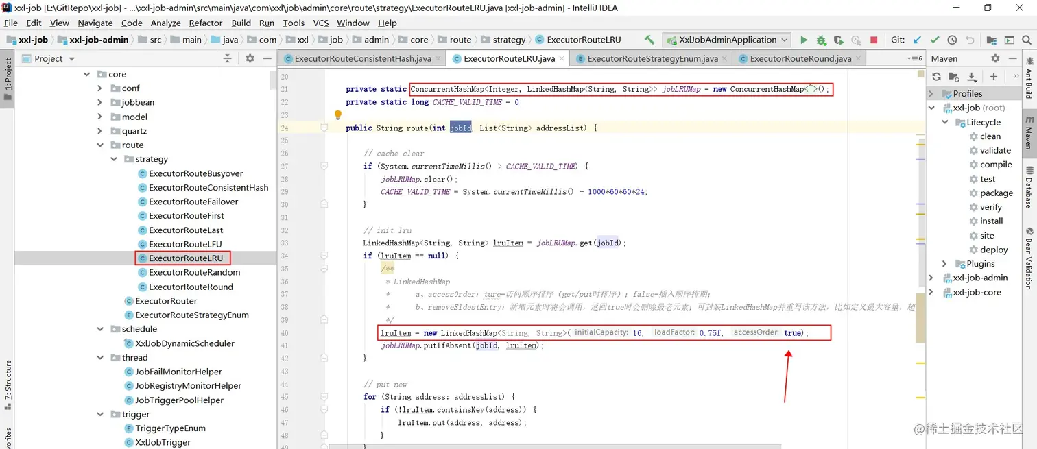 亮点:针对每一个唯一的任务会有一个唯一的jobId,在这里用可以一个静态的同步的Map来存储每个jobId和其对应的最近使用记录,这样可以应对多个定时任务同时触发带来的数据一致性问题,同时也存储了所有调用了的任务的映射。在构造LinkedHashMap的时候设置accessOrder属性为true,实现LRU。