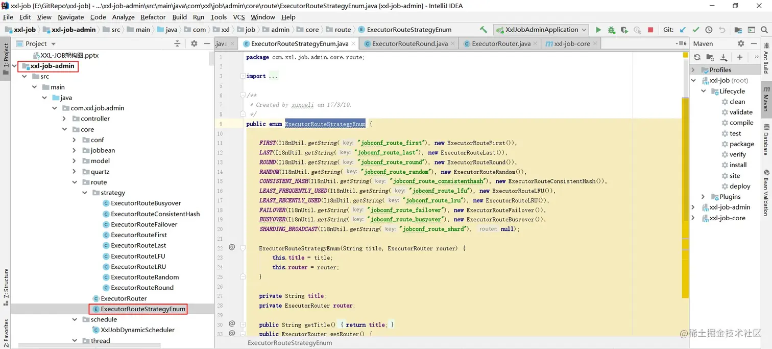 所有的路由策略都是用枚举类Enum来定义的,便于管理和扩展,ExecutorRouteStrategyEnum.Java,代码结构如下图: