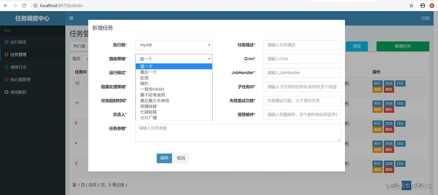 笔者用的XXL-JOB版本为2.0.2,调度界面如下图,路由策略一共有十个,分别是:第一个,最后一个,轮询,随机,一致性HASH,最不经常使用,最近最久未使用,故障转移,忙碌转移,分片广播。
