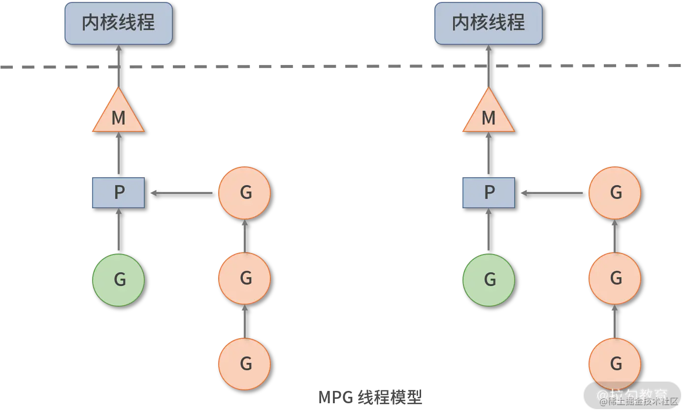 Go 是为数不多在语言层次实现协程并发的语言,它采用了一种特殊的两级线程模型:MPG 线程模型(如下图)。