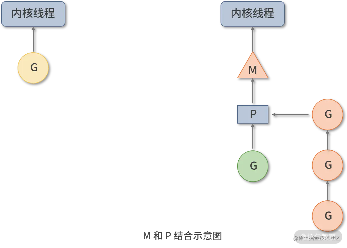 M,即 machine,相当于内核线程在 Go 进程中的映射,它与内核线程一一对应,代表真正执行计算的资源。在 M 的生命周期内,它只会与一个内核线程关联。