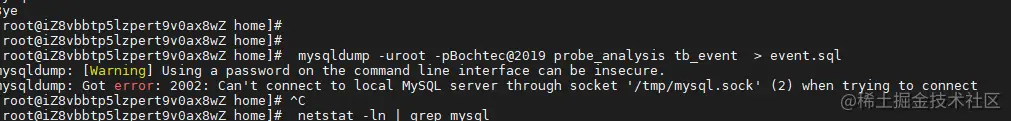 mysqldump --socket=/var/lib/mysql/mysql.sock -uroot -pBochtec@2019 probe_analysis tb_event > event.sql