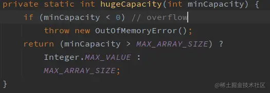 判断之前所需的最小容量minCapacity是否大于集合定义的最大容量(整型最大值 - 8),如果大于newCapacity赋值为整型最大值,反之为集合定义最大容量。