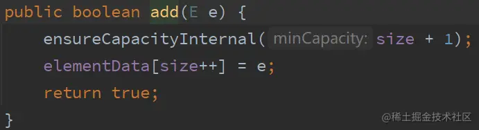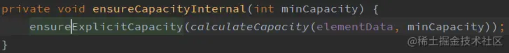 在调用add方法向集合中添加元素时,会先调用ensureCapacityInternal()方法保证数组的容量,参数minCapacity所需要的的最小容量为当前元素的实际个数size + 1,让我们看看ensureCapacityInternal()这个方法。