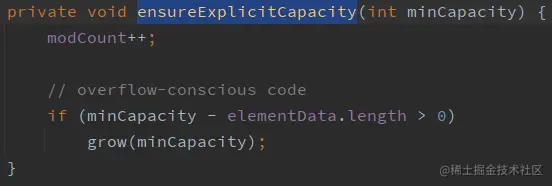 这里之所以要确认一下最小容量,主要是当使用无参构造函数来创建集合时,数组的默认容量为10,第一次向集合中添加元素时会直接把数组的容量扩为10,这里的minCapacity赋值为10,有参构造函数第一次添加元素,minCapacity仍然为size + 1。