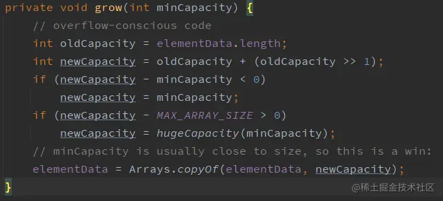 即数组容量扩容为原来的1.5倍(向下取整)。在newCapacity和minCapacity中取最大值作为数组的最终扩容容量赋值给newCapacity。然后判断最终扩容容量是否大于集合所定义的最大容量,如果大于调用静态方法hugeCapacity()。