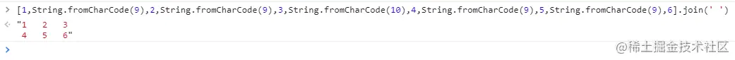 [1,String.fromCharCode(9),2,String.fromCharCode(9),3,String.fromCharCode(10),4,String.fromCharCode(9),5,String.fromCharCode(9),6].join(' ')