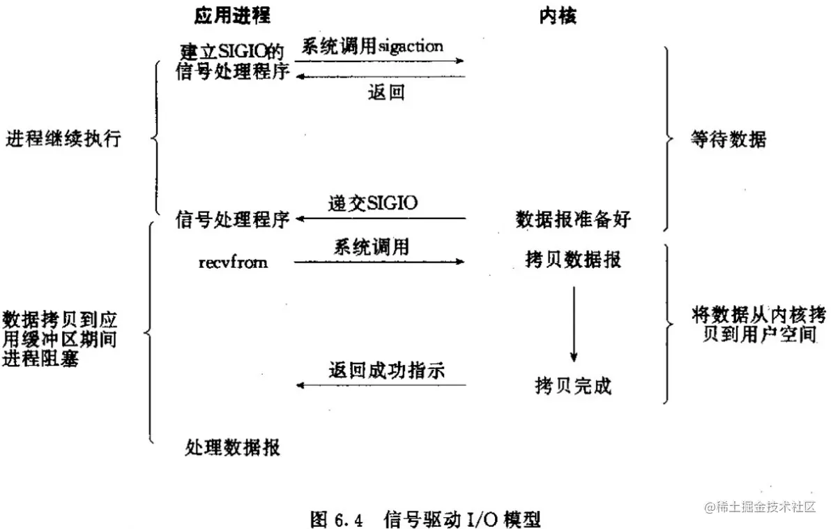 首先开启套接口信号驱动IO功能,并通过系统调用sigaction执行一个信号处理函数(非阻塞)。当数据准备就绪时,就为该进程生成一个SIGIO信号,通过信号回调通知应用程序调用recvfrom来读取数据。