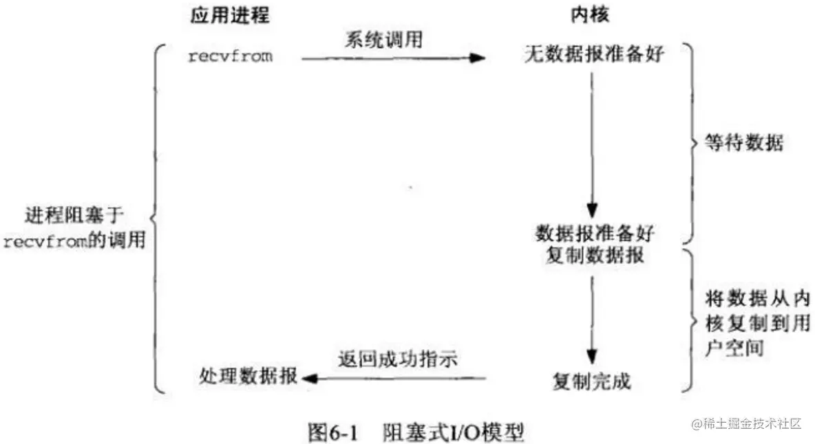在用户空间中调用recvfrom,系统调用直到数据报到达且被复制到应用程序的缓冲区中或发生错误才返回,在此期间进程处于阻塞状态。