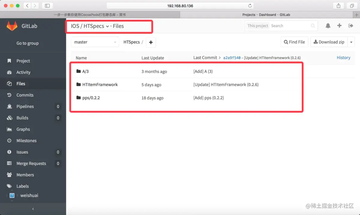 提交成功后gitlab里的私有仓库能看到上传的项目配置文件