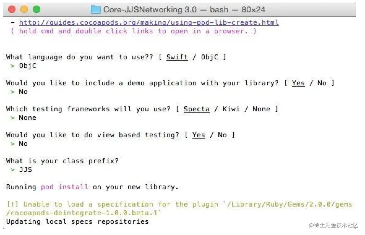pod lib create 项目名第一个问题是我们需要选择的开发语言,这里我们选择