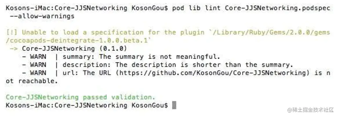 pod lib lint验证类库是否符合 pod 的要求,可以使用--allow-warnings来忽略一些警告,建议在打 tag 前运行此命令,检查自己写的pod是否报错,在push到远程Specs的时候(步骤5),会自动运行此步骤。