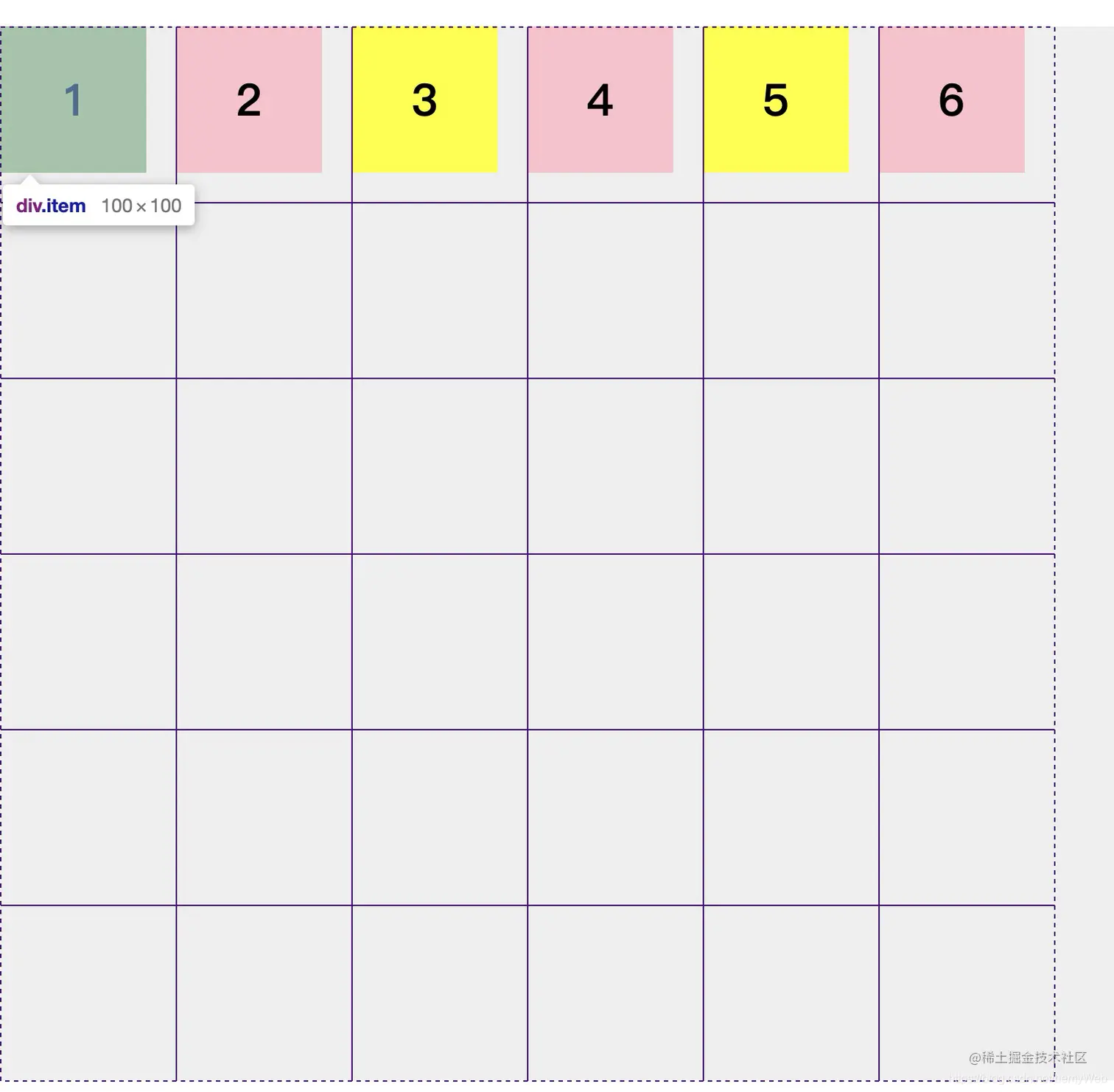 可以通过grid-template-rows: 120px 120px 120px 120px 120px 120px;设置每一行的宽度,然后通过设置grid-template-columns: 120px 120px 120px 120px 120px 120px;来改变列的宽度。此时,页面样式变成了这样:
