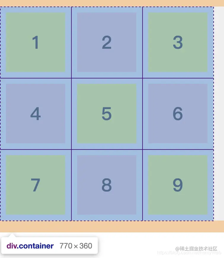 grid-row-gap和grid-column-gap属性来设置网格线的间隙: 示例代码页面效果.container { display: grid; grid-template-rows: 120px 120px 120px; grid-template-columns: 120px 120px 120px; grid-row-gap: 20px; grid-column-gap: 20px; }