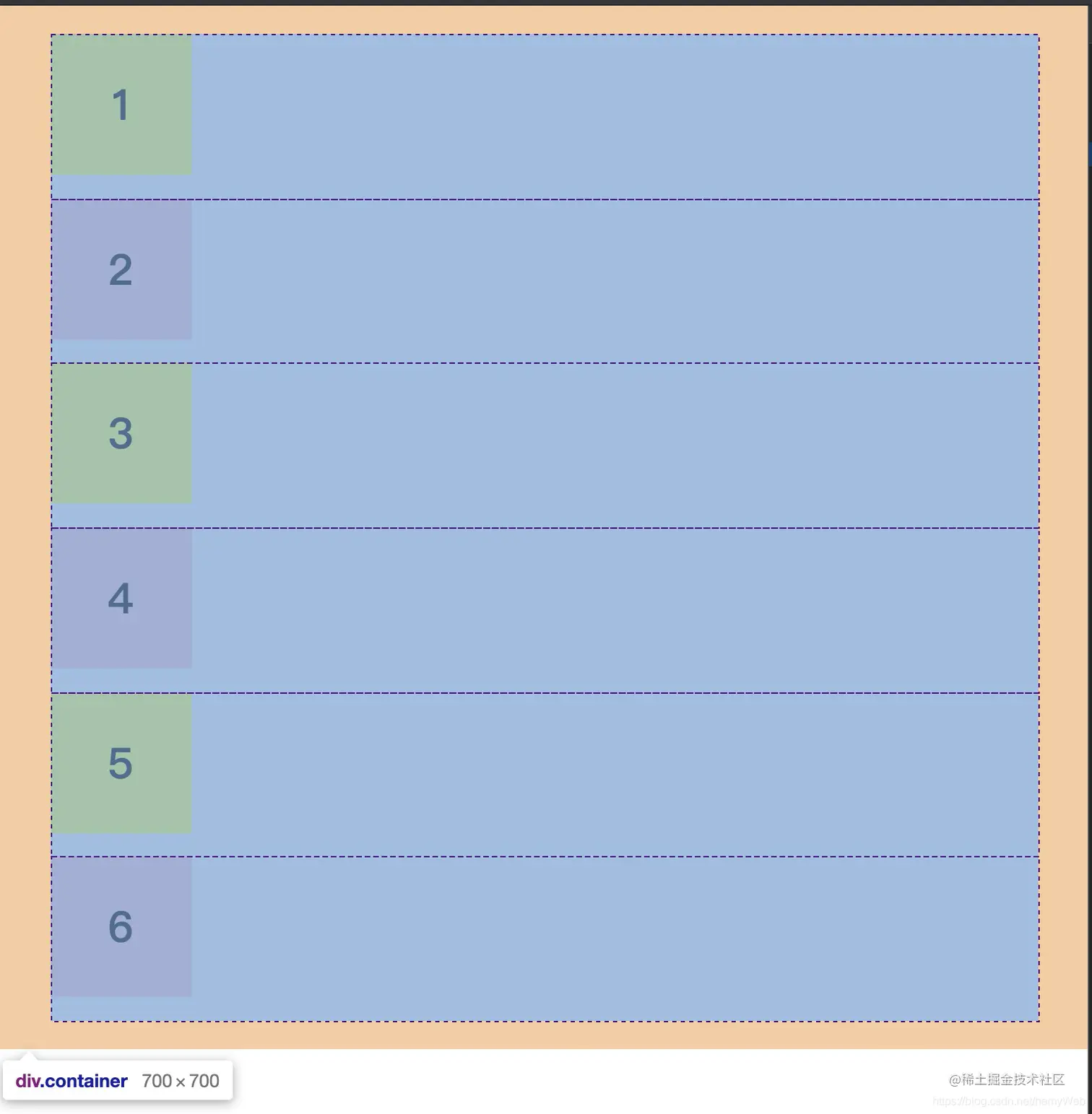 此时,通过检查元素可以发现,给父容器声明grid布局之后,容器根据内容自动分割成了6行()。到这儿,我突然明白了什么....grid不同于flex的“轴”的概念,所以发现此时虽然已经设置了父容器为grid,但是容器内的元素仍然是流式排列。既然此处有了行,那么应该也会有列的概念,以及该如何设置行和列的宽度和位置的问题。