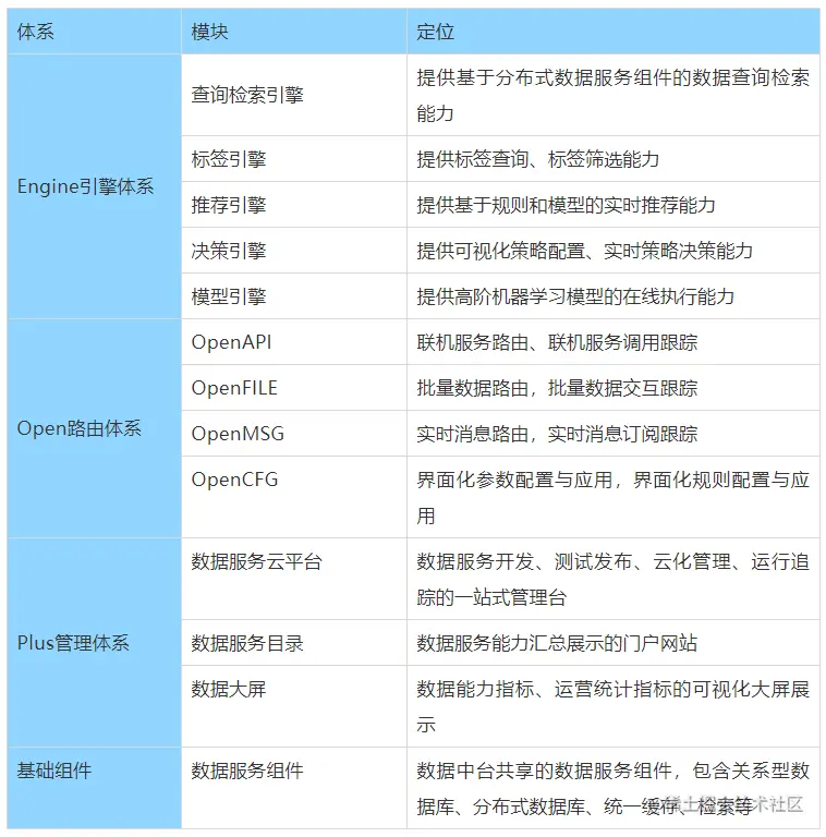 民生银行数据中台体系采用“微服务+云化技术”作为基础技术架构选型,核心运转模式由 Engine 引擎体系、 Service 服务体系、 Open 路由体系、 Plus 管理体系各类专项组件协同运转完成: