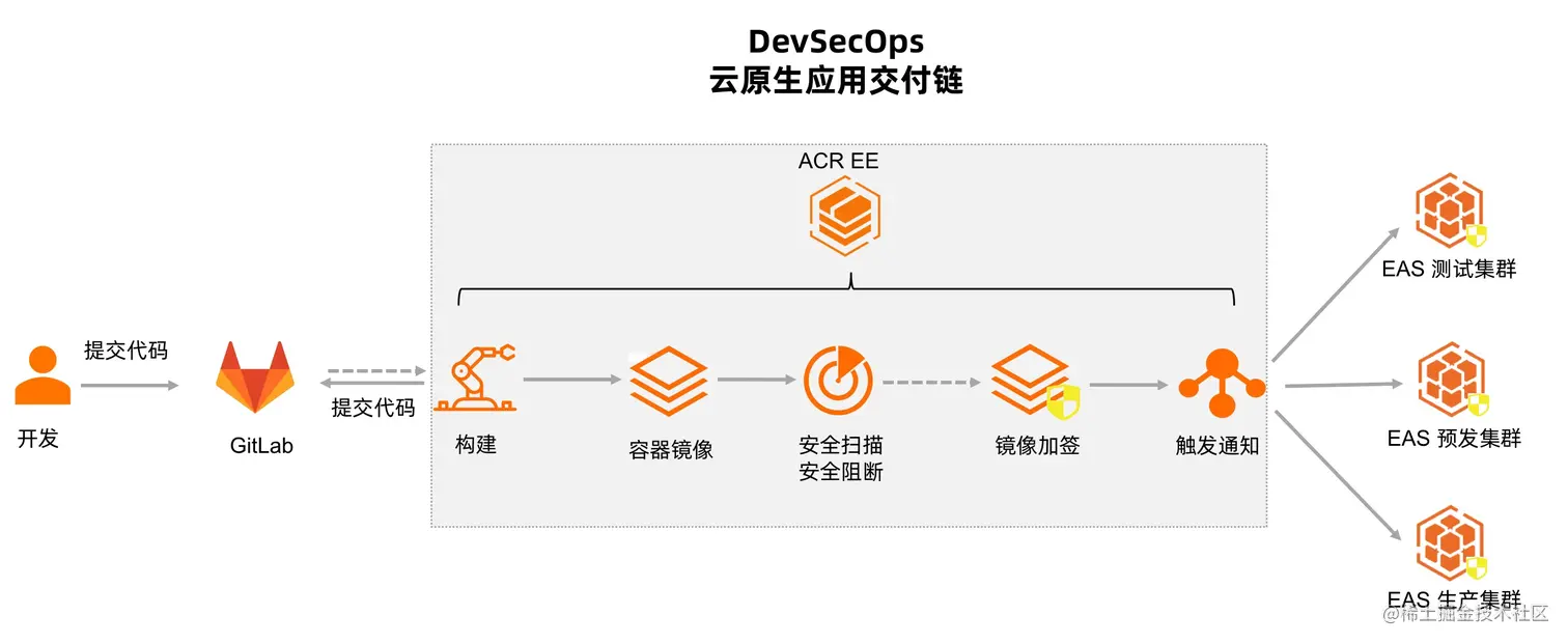 (3)ACR EE 上创建了云原生应用交付链的 DevSecOps 流程。交付链将保障容器镜像自动安全扫描,如果发现高危漏洞则基于安全策略阻断后续的交付部署。如果通过安全扫描流程,则自动将镜像加签并触发后续不同环境的镜像部署。