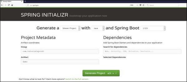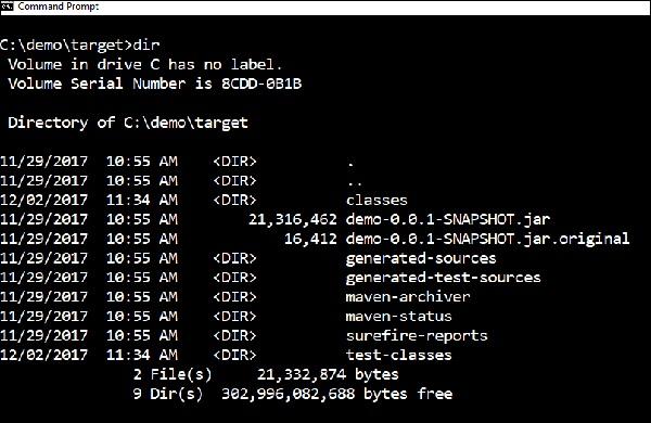<?xml version="1.0" encoding="UTF-8"?><project xmlns="http://maven.apache.org/POM/4.0.0" xmlns:xsi="http://www.w3.org/2001/XMLSchema-instance" xsi:schemaLocation="http://maven.apache.org/POM/4.0.0 http://maven.apache.org/xsd/maven-4.0.0.xsd"> <modelVersion>4.0.0</modelVersion> <groupId>com.tutorialspoint</groupId> <artifactId>demo</artifactId> <version>0.0.1-SNAPSHOT</version> <packaging>jar</packaging> <name>demo</name> <description>Demo project for Spring Boot</description> <parent> <groupId>org.springframework.boot</groupId> <artifactId>spring-boot-starter-parent</artifactId> <version>1.5.8.RELEASE</version> <relativePath /> <!-- lookup parent from repository --> </parent> <properties> <project.build.sourceEncoding>UTF-8</project.build.sourceEncoding> <project.reporting.outputEncoding>UTF-8</project.reporting.outputEncoding> <java.version>1.8</java.version> </properties> <dependencies> <dependency> <groupId>org.springframework.boot</groupId> <artifactId>spring-boot-starter-web</artifactId> </dependency> <dependency> <groupId>org.springframework.boot</groupId> <artifactId>spring-boot-starter-test</artifactId> <scope>test</scope> </dependency> </dependencies> <build> <plugins> <plugin> <groupId>org.springframework.boot</groupId> <artifactId>spring-boot-maven-plugin</artifactId> </plugin> </plugins> </build></project>